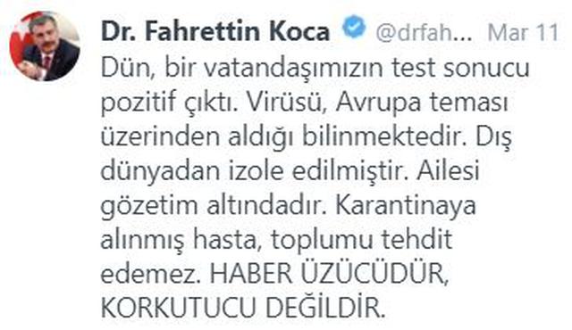 Tarihler 11 Mart 2020 yi gösterdiği sırada Sağlık Bakanı Fahrettin Koca'nın açıklaması ile test yapılan bir vatandaşımızın test sonucu pozitif çıktı , bu sonuç Türkiye'yi yeni bir yola sürükledi.